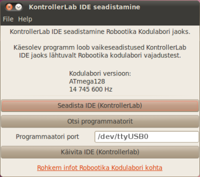 Vajutades nuppu “Seadista IDE” seadistatakse KontrollerLab IDE arvestades Kodulabori vajadusi ja programmaatori porti.