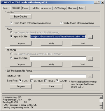 3. Programmaatori aknas sisestada Flash-sektsioonis tekstikasti Input HEX File kompileeritud fail. Seda saab teha “…” nuppu vajutades. Kompileeritud fail asub tavaliselt projekti alamkataloogis default ja see on sama nimega, mis projekt, kuid laiendiga “.hex”, näiteks “labor1.hex”. Pärast õige faili valimist vajutada nupule Program, mis laeb valitud programmi kontrollerisse. Kui kõik õnnestus, tekib programeerimiskeskkonna allosasse teade: