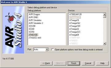 3. Järgnevalt avaneb aken, kus tuleb märkida kasutatav silumise platvorm ja mikrokontrolleri tüüp. Kodulaboris on silumise platvormina kasutusel JTAG ICE programmaator ja mikrokontrolleriks on ATmega128. Projekti lõplikuks loomiseks vajutada nupule Finish.