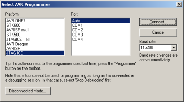 Kui eespool toodud aken ei avane ja avaneb aken Connection Failed, siis puudub ühendus programmaatoriga. Esmalt tuleks kontrollida, kas mikrokontrolleril on järel toide ja kas programmaator on ühendatud õigesti (JTAG pistikusse, kaabel õiges suunas). Kui see on korras, siis tuleks kontrollida, mis COM pordi numbri on Windows programmaatorile omistanud. Kui see on suurem 9-st, siis ei pruugi tarkvara seda leida ja pordile tuleb omistada väiksem järjenumber.