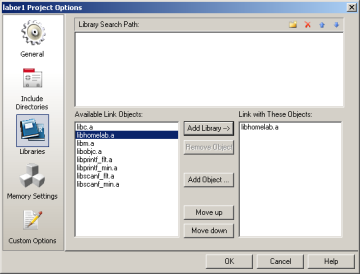 1. Avada projekti seaded menüüst Project → Configuration Options. Seadete kaardil Libraries tuleb sinna, kuhu on lisatud Kodulabori teegi objekt libhomelab.a, järgi lisada ka libprintf_flt.a ja libm.a.