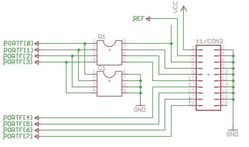 Madalpääsu filter on võimalik koostada analoogsisendite 0-3 vahele (PF0-PF3). Madalpääsu filtri koostamiseks paigutatakse vastavatesse pesadesse takisti ja kondensaator. Vaikimisi on madalpääsu filter koostatud kanalile PF0. Takisti väärtuseks on 10 kΩ ja kondensaatori väärtuseks 100 nF.