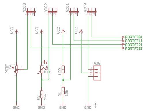 Andurid on ühendatud läbi jumperi, võimaldades sisendisse suunata, kas välise anduri signaali (ühendatud pistikusse X1/COM2) või plaadil oleva anduri signaali. Vaikimisi on analoog sisenditega (PF0-PF3) ühendatud kõik plaadil olevad andurid.