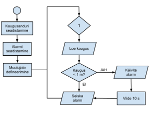 Järgnev diagramm kirjeldab süsteemi, mis kontrollib 1 m ala ja kui kontrollitavasse alasse siseneb objekt, käivitab kümneks sekundiks alarmi. Alarm töötab niikaua, kui objekt on kontrollitavast alast väljunud.