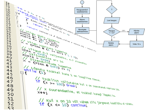 Roboti või muu intelligentse seadme toimimiseks on vaja arendajal koostada seadmele konkreetne toimeloogika, mis arvestab konkreetse süsteemi riistvaraga. Levinud praktika süsteemi käitumise eeskirja kirjapanekuks on algoritmi koostamine. Algoritmi võib teha graafiliselt kasutades näiteks plokkdiagrammi. See annab hea ülevaate, mida süsteem tegema peaks ja kuidas erinevates olukordades käituma. Graafilist plokkskeemi, aga otse mikrokontrolleri masinkoodiks üldjuhul ei genereerita (va erilahendused nn Lego Mindstorm, Labview, vms) vaid selleks tuleb luua algoritmist lähtuv programmi kood. Kuigi mikrokontrolleritele on olemas enamus kõrgkeelte kompilaatorid on kauaaegne populaarne PC arvutite programmeerimiskeel C laialt levinud ka mikrokontrollerite programmeerimisel. C on lakooniline riistvaralähedane keel, mis võimaldab kirjutada riistvara võimalusi efektiivselt kasutavat programmikoodi. C-keele süntaksis on võtmesõnu minimaalselt, kuid sisaldab palju erineva tähendusega märke, mis teevad keele õppimise raskeks. Järgnev peatükk sisaldab lühiülevaadet algoritmidest ja C-keele süntaksi osadest, mis on kasutusel ka praktiliste näidete juures. Algajal on C-keele kohta soovitatav lugeda täiendavaid materjale.