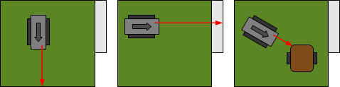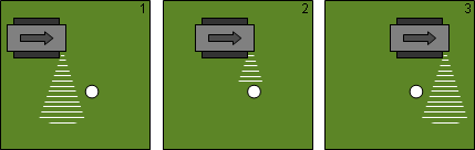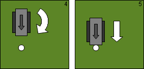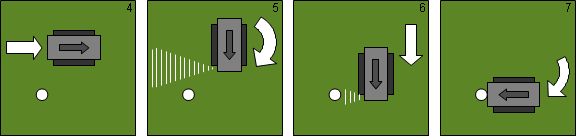 Edasi on põhimõtteliselt lihtne - robotil tuleks keerata 90 kraadi paremale ja sõita pallini, kuid paraku ei ole palli kõrvale seisma jäämine ja pööre nii täpne, et robot saaks kätte poole meetri kaugusel oleva palli. Selleks on pärast palli avastamist kaks varianti: kohe palli püüdma minek või selle lähemalt otsimine. Kui pall asub robotist kuni 30 cm kaugusel pöörab robot kohe palli poole ja üritab selle kätte saada nii nagu on näidatud ka järgneval skeemil: