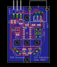 RC5 vastuvõtja skeemi ja trükkplaadi pildid. Skeemi ja trükplaadi failid, tarkvara ning komponentide nimistu paiknevad lehekülje alumises osas, alajaotuses “Failid”.