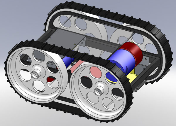 Rataste loomisel kasutasime ära meie CNC pingi 2.5 teljelisust. See tähendab seda, et rattad on lõigatud kahes erinevas Z kordinaadis. Vedava telje rattad kinnituvad otse mootorite väljundvõllidele. Veetava telje rattad on asetatud ühele teljele. Telg ise on paigal ja kinnitub kronsteinidega ühe ühendustala külge. Kronsteinide kaugust talast saab muuta pingutades ühenduses olevaid polte. See tähendab seda, et roomikute pinget on võimalik väga mugavalt reguleerida.