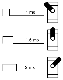 Le signal de contrôle du servomoteur est une impulsion spécifique avec un signal modulé (PWM), qui avec l’impulsion détermine la position du rotor. La période du signal est de 20 ms (50 Hz) et la largeur du pic est de 1 ms – 2 ms. 1 ms marque l’une des positions extrêmes et 2 ms marque la seconde. 1,5 ms marque la position centrale du rotor du servomoteur.