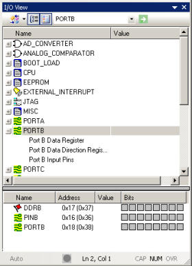 Pour démarrer le programme dans le mode débugger avec le Studio AVR, le programme doit être compilé en appuyant sur le bouton build (F7) puis il doit être démarré avec la commande Run (F5). Il est possible d'ajouter au code source des break point (F9) à l'endroit où l'on veut faire une pause dans l'exécution. Si l'exécution du programme se déroule correctement jusqu'au break point, le programme s'arrête et l'état du micro-contrôleur peut être contrôlé en l'état. L'exécution du programme peut être relancée en donnant la commande Run à nouveau ou en utilisant l'exécution au pas à pas en utilisant la commande Step Into (F11).