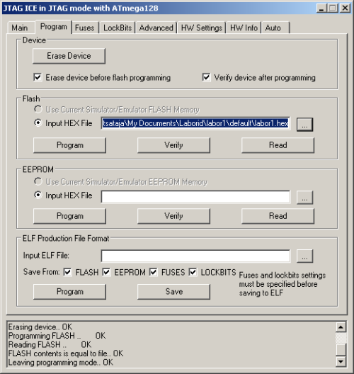 3. Dans la fenêtre du programmeur insérer dans la section Flash dans le champ Input HEX File l’endroit où est stocké le fichier compilé en appuyant sur le bouton ”…”. Le programme compilé se trouve habituellement dans le dossier du projet puis dans le dossier default. Le fichier à le même nom que le projet avec l’extension ”.hex”, par exemple “labor1.hex”.