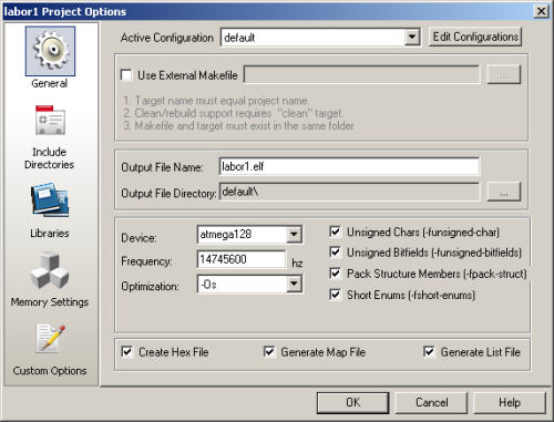 5. Avant la première compilation il est nécessaire de régler certains paramètres du projet. Les paramètres importants sont la fréquence du contrôleur ainsi que la méthode d’optimisation. Le contrôleur HomeLab fonctionne à une fréquence de 14,7456 MHz (14745600 Hz). La fréquence peut être réglée dans les propriétés du projet en Hz (et non en MHz) : Project → Configuration Options → General. La méthode d’optimisation doit rester -Os, s’il n’y a pas nécessité d’utiliser une autre méthode.