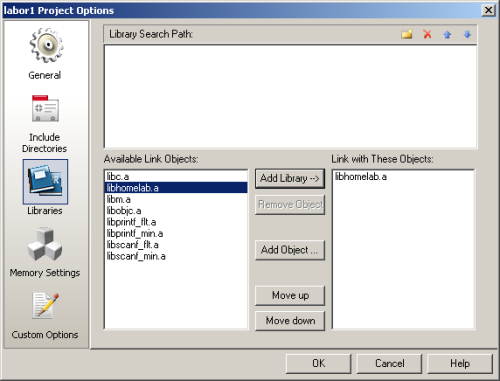 1. Ouvrir le menu option du projet par Project → Configuration Options. Dans l'onglet de configuration Libraries, où l'on retrouve l'objet libhomelab.a de la librairie du HomeLab, ajouter les objets libprintf_flt.a et libm.a.