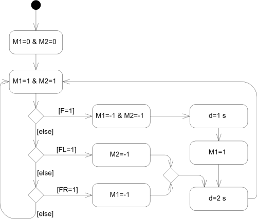 Алгоритм описывает логику управления системой и изображен в виде блок-схемы. Нескольких элементов и описания их соотношений достаточно, чтобы создать простой алгоритм. Если алгоритм робота составлен правильно, то относительно легко составить программу управления для этого робота. В алгоритме обычно используется два различных объекта: прямоугольник с закругленными углами, который обозначает какую-либо деятельность, и маленький ромб для проверки какого-либо условия, после чего следует затем запуск дальнейшей деятельности в соответствии с результатами проверки.